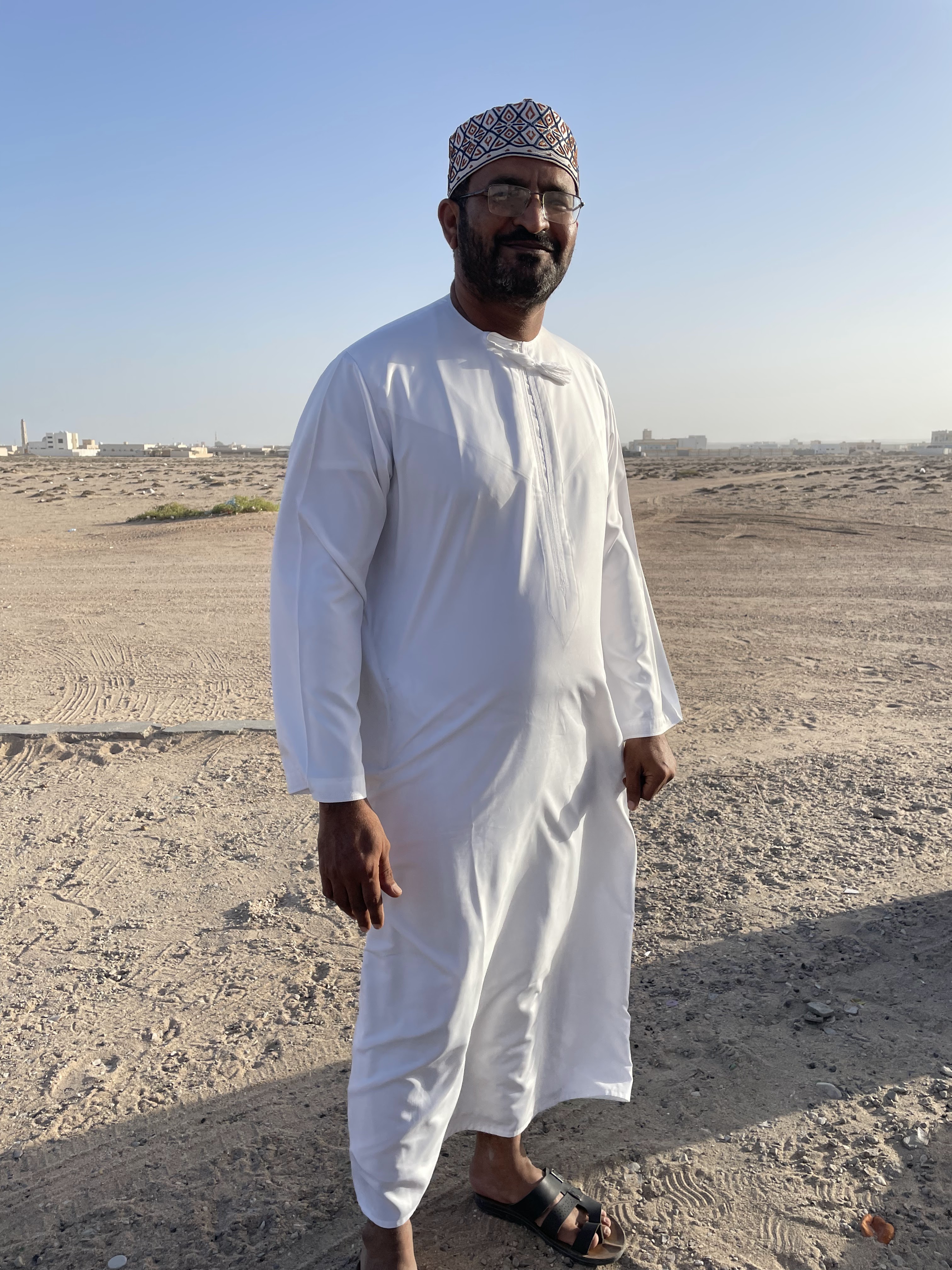 Jurgen, lui, est fasciné par les tenues des hommes en blancs avec leurs kumahs brodés, ce chapeau traditionnel sur la tête. Tous portent des vêtements traditionnels ici. Jurgen s’étonne que le blanc soit utilisé dans la mesure où la tradition veut aussi que les gens partagent un plat et mangent avec les mains, assis par terre. Pas pratique tout de même ce blanc. Ça doit expliquer le nombre de blanchisseries que nous avons passées sur la route. Hier au bord de la plage de Ras al Hadd, nous avons croisé une famille. Talal, le père, nous a offert le café traditionnel Omanais. Cela ressemble à un café turc avec de la cardamone et des épices. Il faut le boire vite et généralement l’accompagner d’une sorte de pâte sucrée à la pistache.