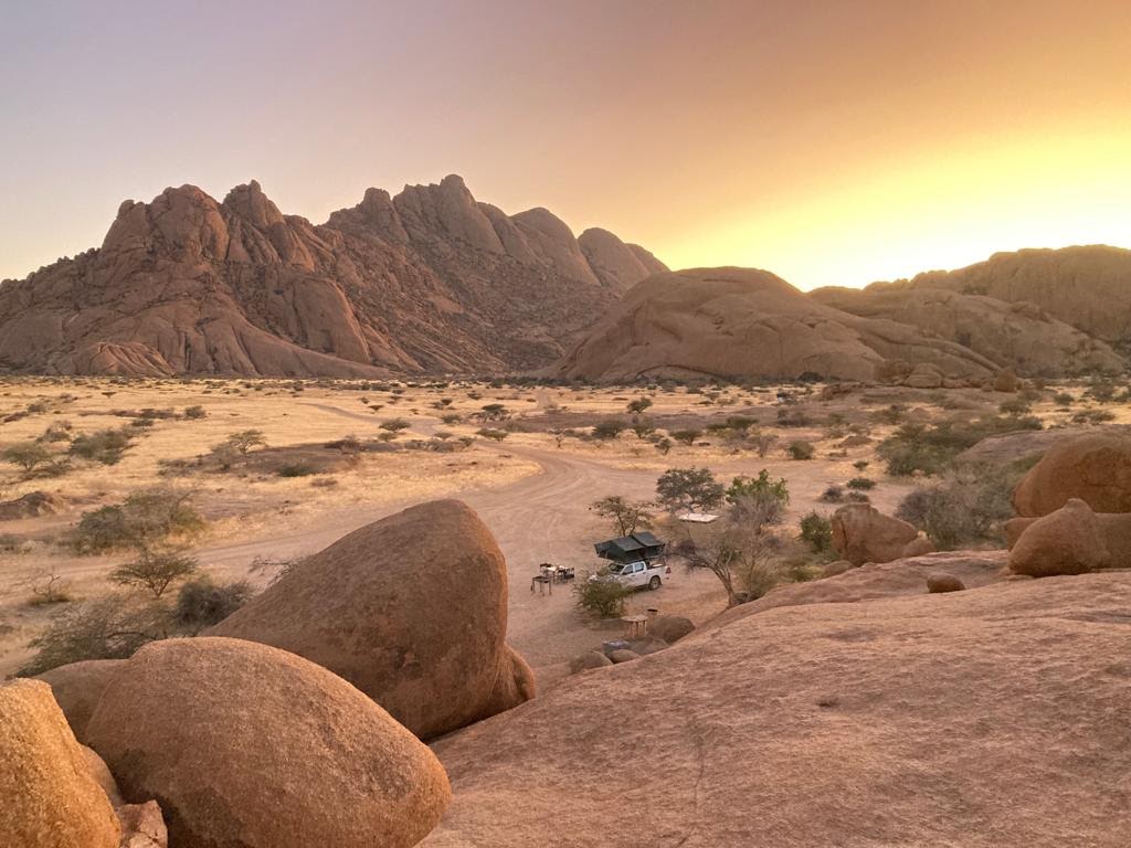 At the end of our first week, we arrived at a community-run campsite at Spitzkoppe. It’s managed by families from the nearby village, providing much-needed income in a region where livelihoods are scarce. We stopped by the village, bought a few souvenirs from the small stand run by two mothers who had been standing in the sun all day, waiting for tourists. We asked if they had children and if they went to school, then handed each of them a bottle of water. As we were leaving, one of the women gave us a traditional African greeting, with a high-pitched call and a dance beside our car. It was a heartfelt gesture that made us feel truly welcome.