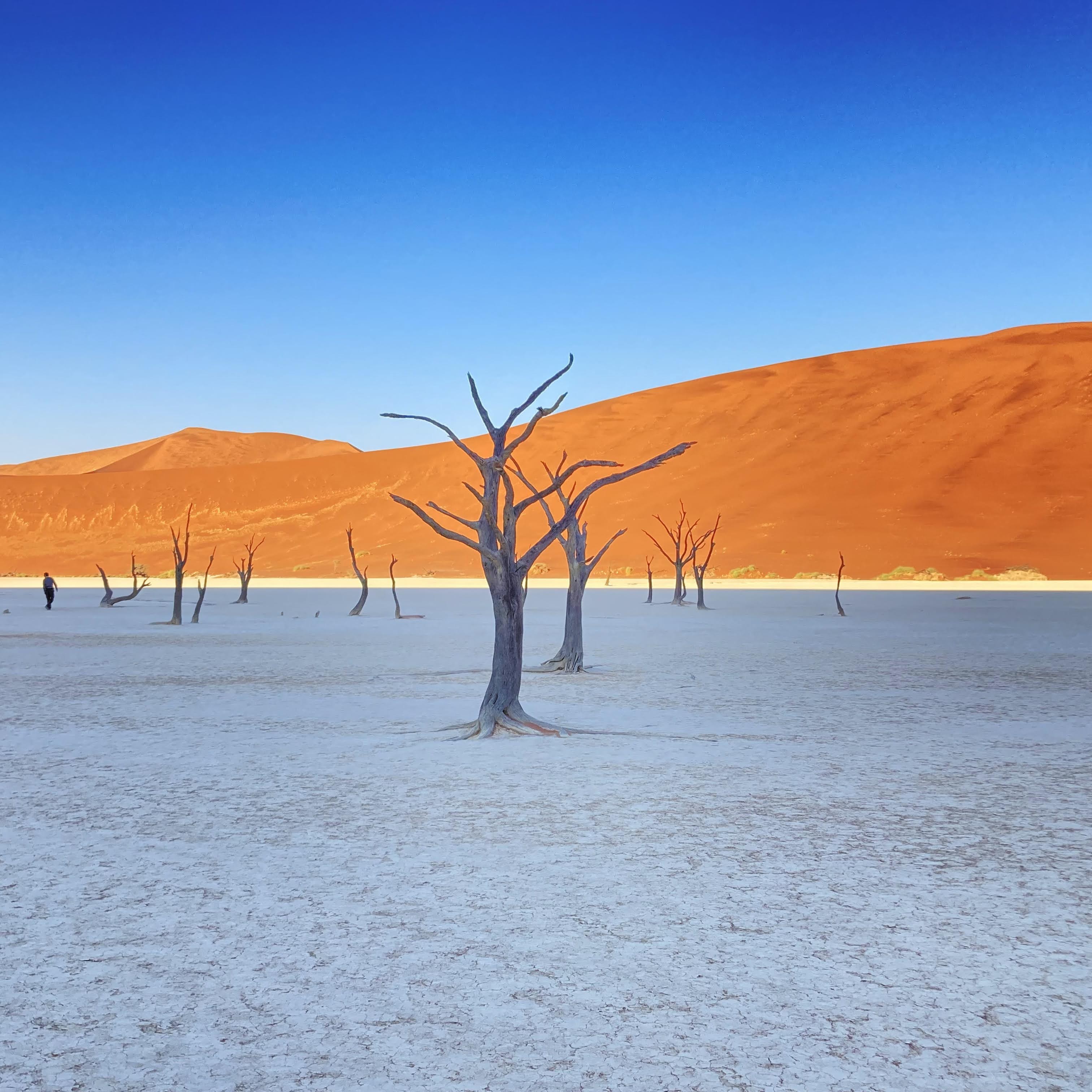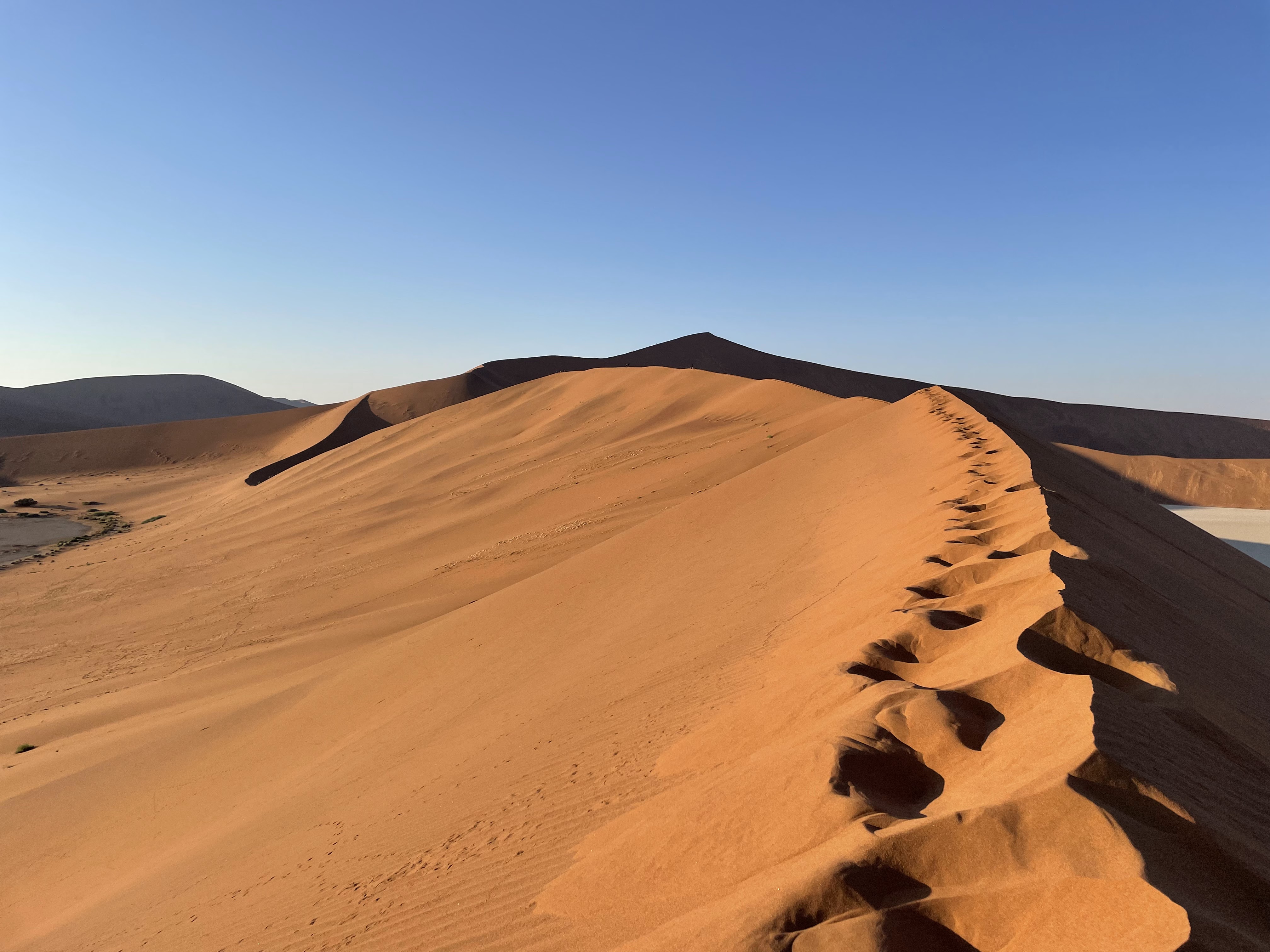 The most special place of our first week came a few days later when we headed north from Aus toward Sossusvlei. White clay pans (vleis) in the middle of the desert create a stark contrast with the ochre-red sand dunes and the vivid blue sky. We woke up early and climbed the dunes at dawn. Our footsteps formed a messy trail along the crest of the dune.